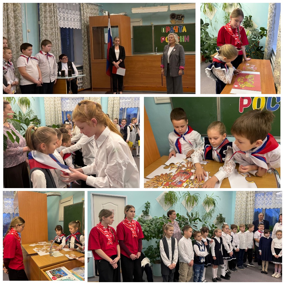 До официальной церемонии Советник директора по воспитанию Светлана Доронина и наставники Орлят - ученицы 8в класса Полина Назарова и София Мартынова, провели для младших школьников урок, посвященный символам России.