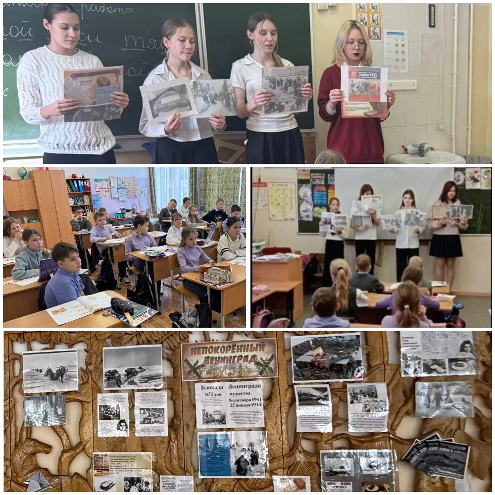27 января активисты Движения Первых София Кулыгина, Арина Неупокоева, Диана Мальгина, Полина Назарова и Анна Плотникова, Никитина Екатерина, Анастасия Бушуева, Виктория Никанорова провели "Устный журнал" для обучающихся 1-4 классов, чтобы вспомнить одно из важнейших событий нашей истории — освобождение города Ленинграда от вражеской блокады.