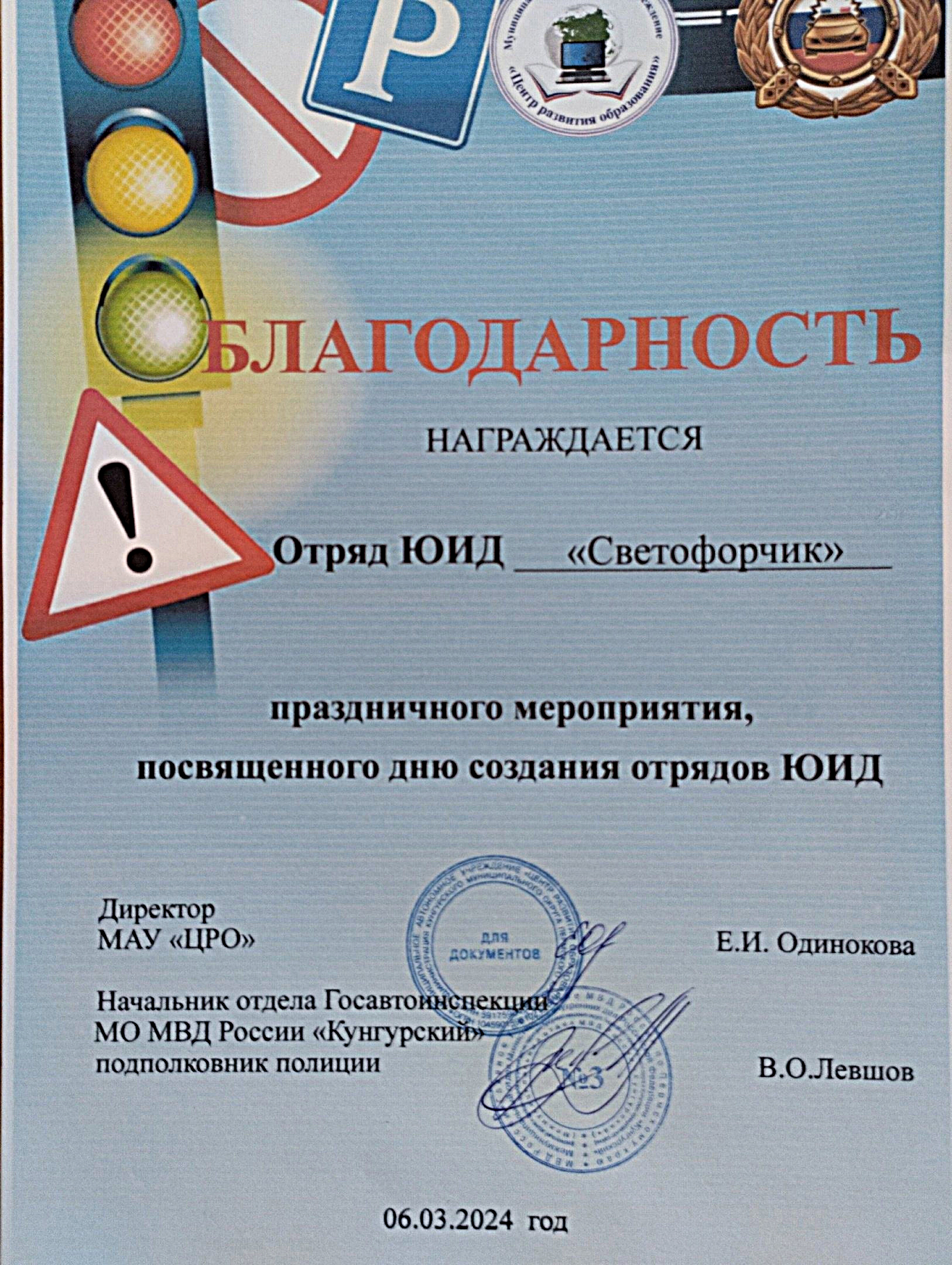 На праздничной линейке руководители отрядов были награждены благодарностью начальника Госавтоинспекции МО МВД России Кунгурский" В.О.Левшова за работу по пропаганде безопасности дорожного движения и участие в праздничном мероприятии.